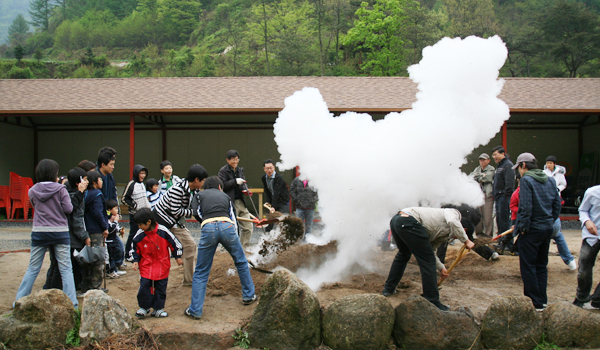 Tourists enjoy a steam pit experience. Afterwards they eat sweet potatoes and eggs out of the steam pit. Credit: handemy.org